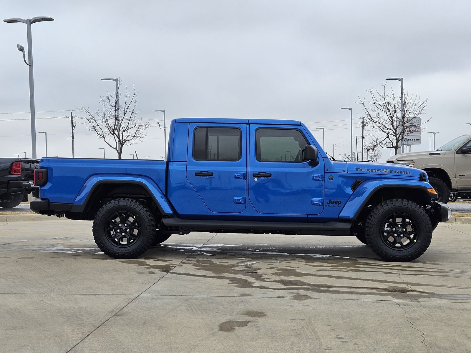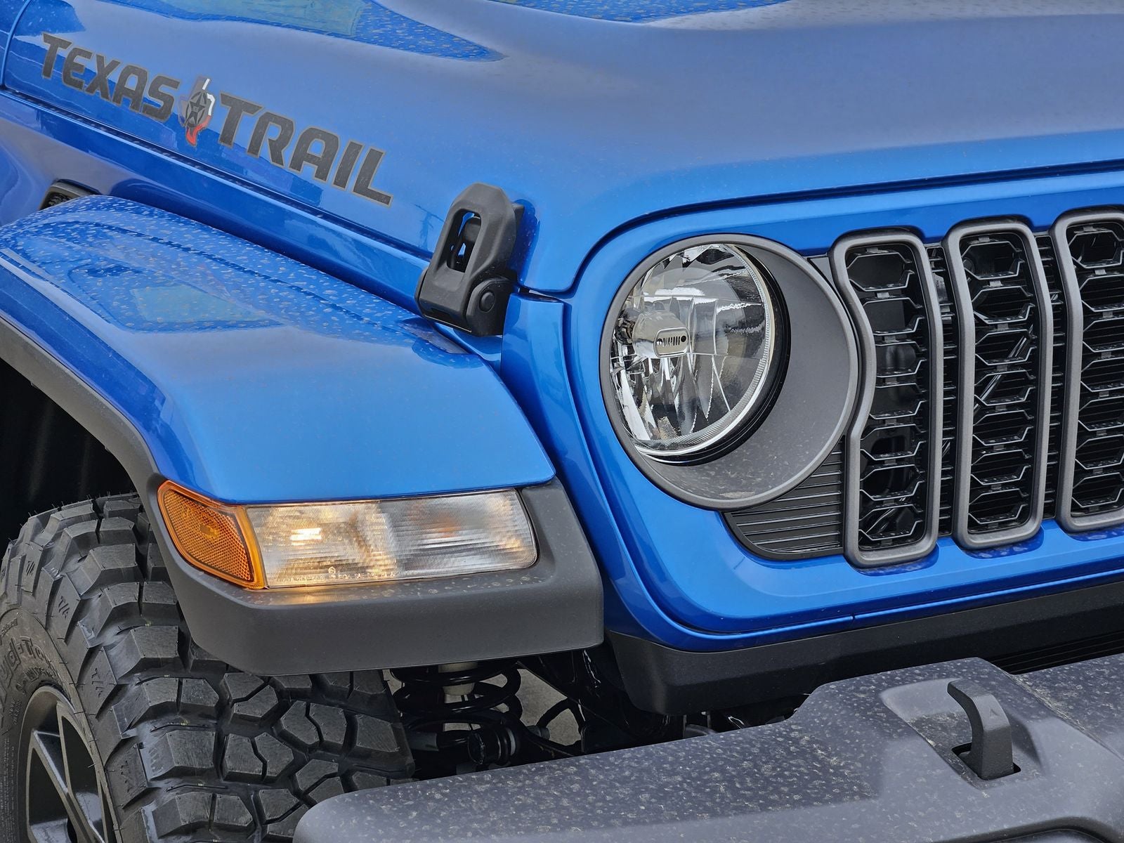The Texas Trail package builds on the Gladiator Sport platform with Willys Suspension, 32-inch LT255/75R17C mud-terrain tires, painted black 17-inch wheels, body-color Freedom Top 3-piece hard top, body-color fender flares, and distinctive Texas Trail hood and tailgate decals. Side steps, deep-tint sunscreen windows, automatic headlamps, and power-heated mirrors add both function and style.