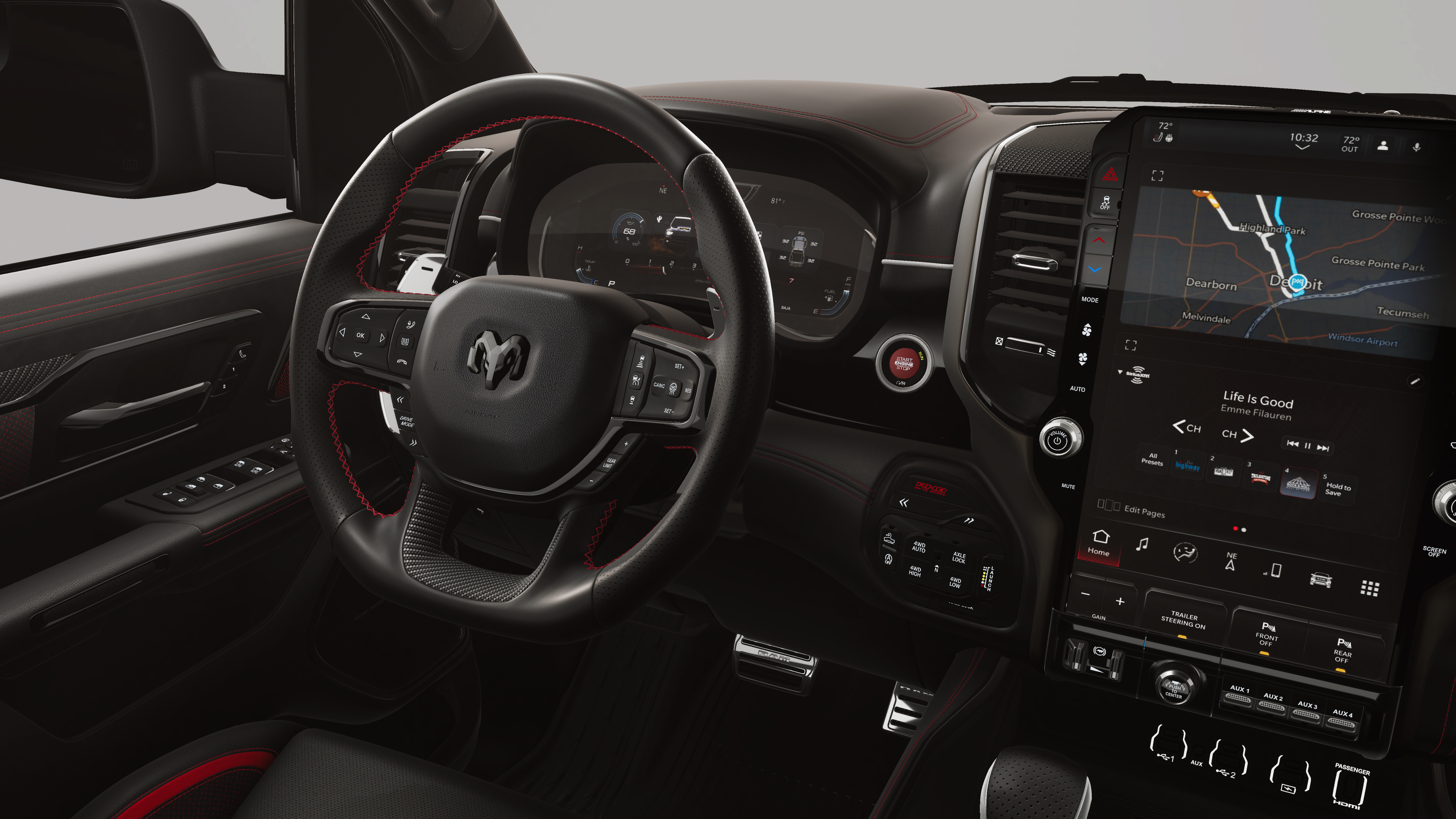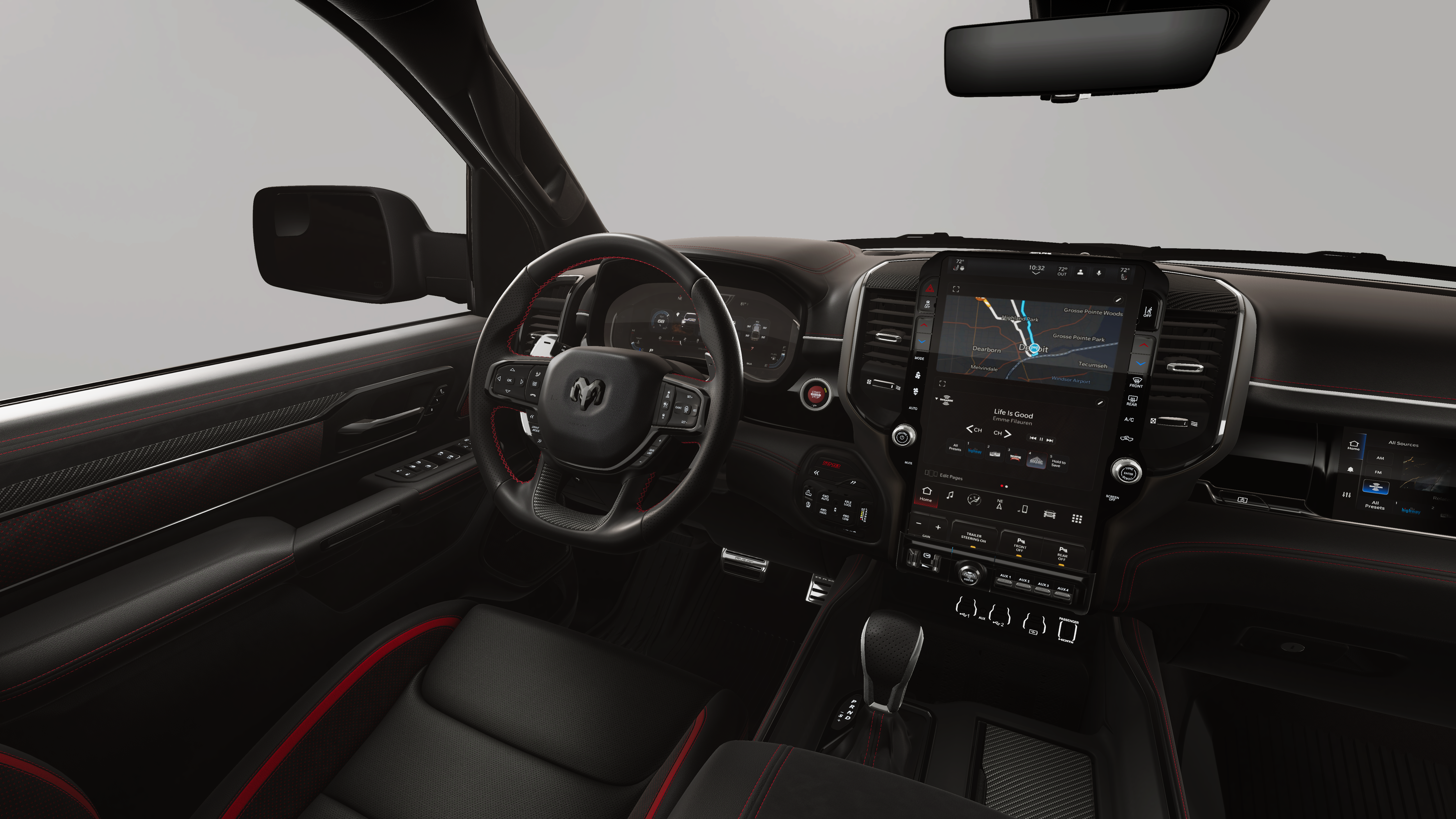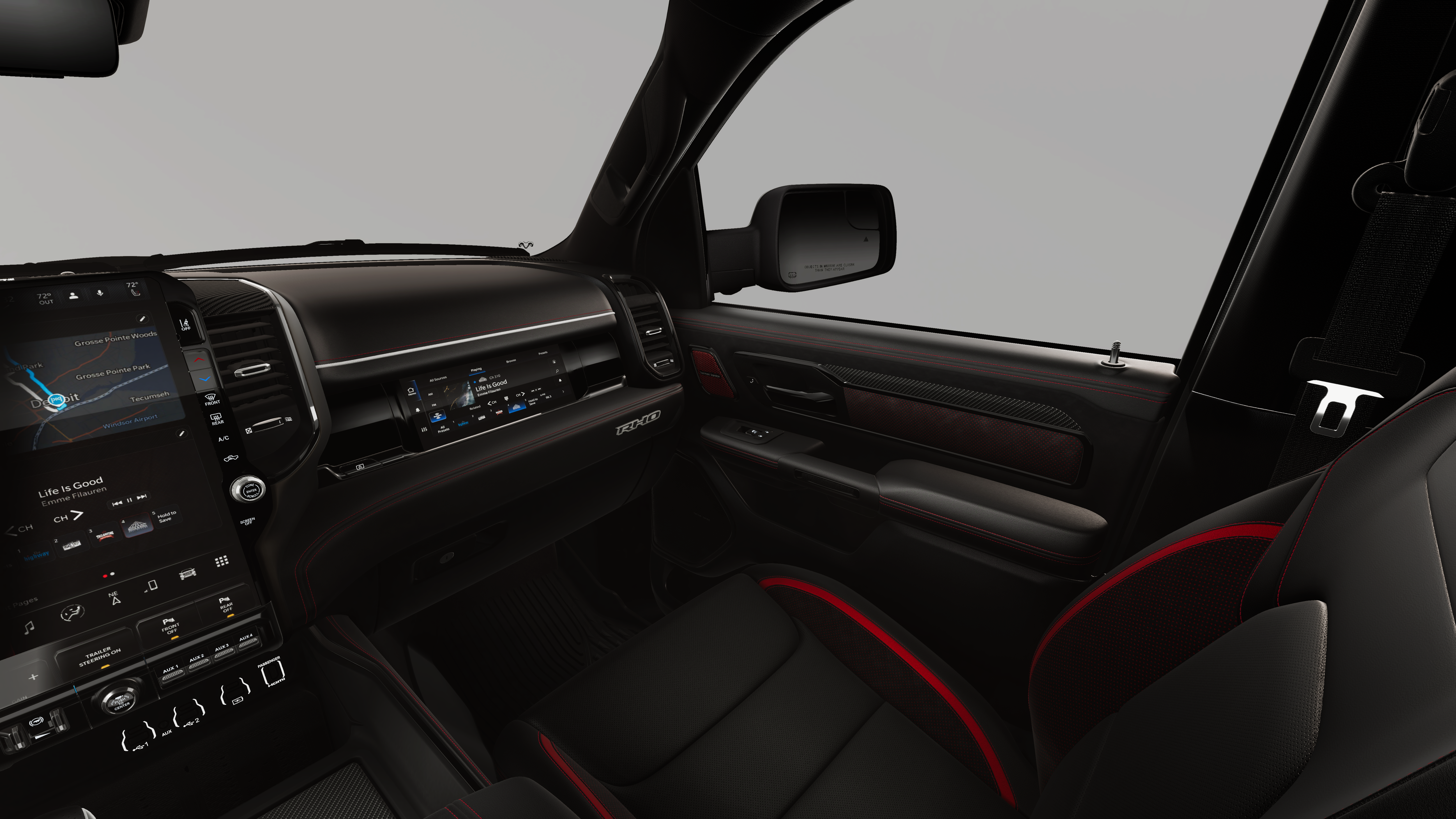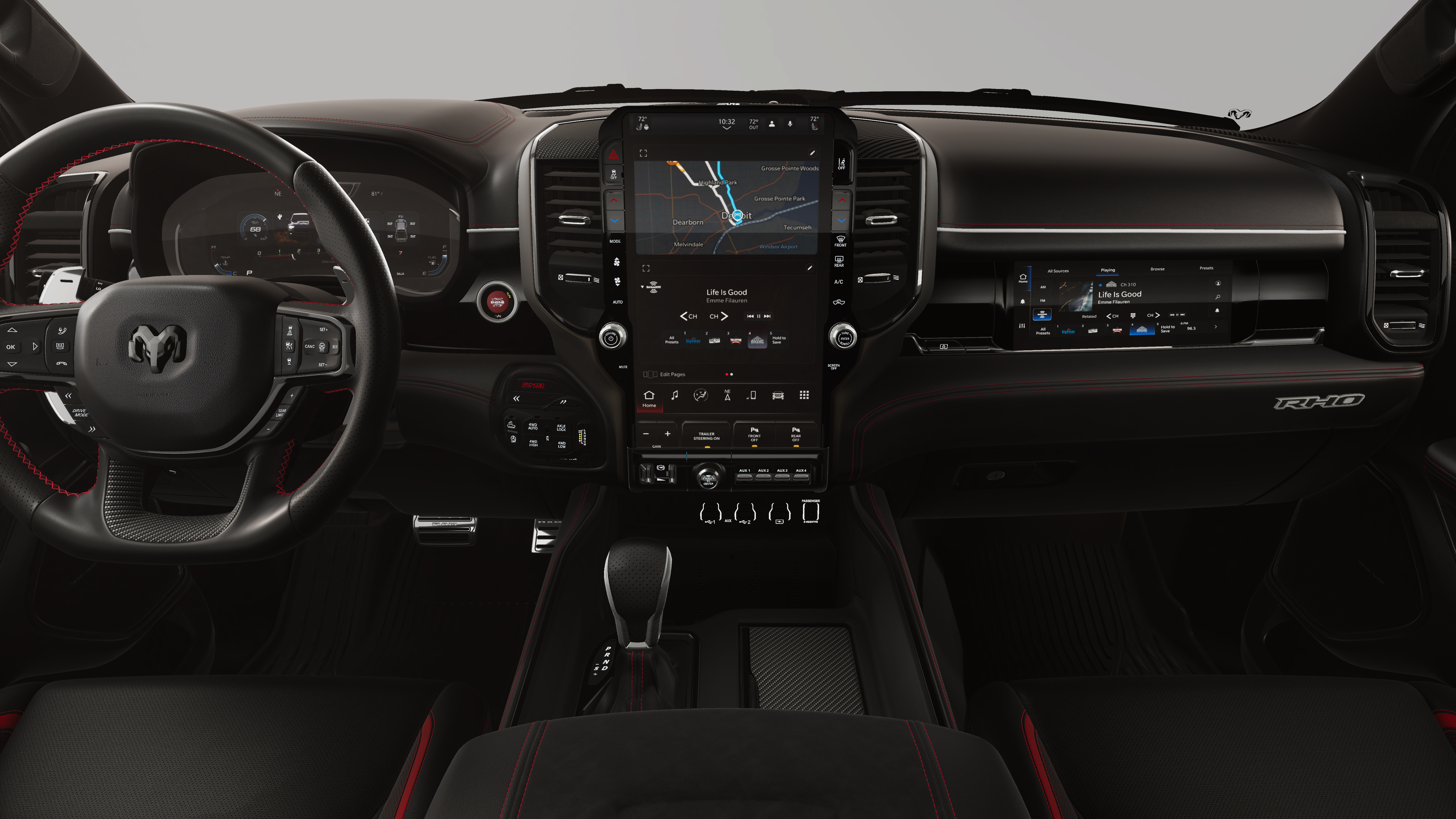 This 2026 Ram 1500 RHO comes nicely equipped with the following Quick Order Package 22Y RHO, RHO Level 1 Equipment Group (12-Way/1-Way Trailer Connector, 14.4 Touchscreen Display, 240 Amp Alternator, 4G LTE Wi-Fi Hot Spot, Connected Travel and Traffic Services, Connectivity - US/Canada, Disassociated Touchscreen Display, Driver Power Seat Back Massage, Driver Seat Memory, Driver/Passenger Wrapped Assist Handles, Drowsy Driver Detection, Dual Wireless Charging Pad, Evasive Steer Assist, Exterior Mirrors with Memory, Front Passenger Interactive Display, Front Passenger Power Seat Back Massage, Full Length Premium Upgraded Floor Console, GPS Navigation, Hands-Free Active Driving Assist System, Harman/Kardon 19 Speaker Premium Sound, HD Radio, Heads-Up Display, Heated Second Row Seats, Integrated Center Stack Radio, Integrated Voice Command with Bluetooth®, Intersection Collision Assist System, Leather/Carbon Flat-Bottom Steering Wheel, LED CHMSL Lamp, Luxury Front Door Trim Panel, Power Adjustable Pedals with Memory, Power Tailgate, Premium Wrapped Instrument Panel Bezel, Radio: Uconnect 5 Nav with 14.4 Display, Radio/Driver Seat/Mirrors/Pedals Memory, Rain Sensitive Windshield Wipers, Real Carbon Fiber Interior Accents, Rear 60/40 Folding Split Recline Seat, SiriusXM Radio Service, Smartphone as a Key Capable, Surround View Camera System, Traffic Sign Recognition, USB Host Flip, Ventilated Front Seats, and Ventilated Rear Seats), Trailer Tow Group (Trailer Reverse Steering Control and Trailer Tire Pressure Monitoring System), 10 Speakers, 3.92 Rear Axle Ratio, 4-Wheel Disc Brakes, ABS brakes, Adaptive suspension, Adjustable pedals, Air Conditioning, Alloy wheels, AM/FM radio, Apple CarPlay/Android Auto, Auto High-beam Headlights, Auto Power-Folding Mirrors, Auto-dimming door mirrors, Auto-Dimming Exterior Driver Mirror, Auto-dimming Rear-View mirror, Automatic temperature control, Brake assist, Compass, Delay-off headlights, Dome Dual LED Reading Lamp, Driver door bin, Driver vanity mirror, Dual front impact airbags, Dual front side impact airbags, Dual-Pane Panoramic Sunroof, Electronic Stability Control, Exterior Mirrors Courtesy Lamps, Exterior Mirrors with Heating Element, Exterior Mirrors with Supplemental Signals, Exterior Parking Camera Rear, Flareside Box, Front anti-roll bar, Front Bucket Seats, Front Center Armrest w/Storage, Front dual zone A/C, Front fog lights, Front License Plate Bracket, Front reading lights, Front wheel independent suspension, Fully automatic headlights, Garage door transmitter, Heated door mirrors, Heated front seats, Heated steering wheel, Illuminated entry, Leather Shift Knob, Leather steering wheel, Leather Trimmed Bucket Seats, Low tire pressure warning, Manufacturer's Statement of Origin, MOPAR Off-Road Style Running Boards, MOPAR RHO Hood Graphics, Navigation System, Occupant sensing airbag, Outside temperature display, Overhead airbag, Overhead console, Panic alarm, Passenger door bin, Passenger vanity mirror, Power door mirrors, Power driver seat, Power passenger seat, Power steering, Power windows, Radio data system, Radio: Uconnect 5 Navigation with 12.0 Display, Rear reading lights, Rear seat center armrest, Rear step bumper, Rear window defroster, Red Interior Accents, Remote keyless entry, Security system, Speed control, Split folding rear seat, Sport steering wheel, Steering wheel mounted audio controls, Tachometer, Telescoping steering wheel, Tilt steering wheel, Traction control, Tri-Fold Tonneau Cover, Trip computer, Turn signal indicator mirrors, Variably intermittent wipers, Voltmeter, and Wheels: 18 x 9 Black Paint/Polish Aluminum.