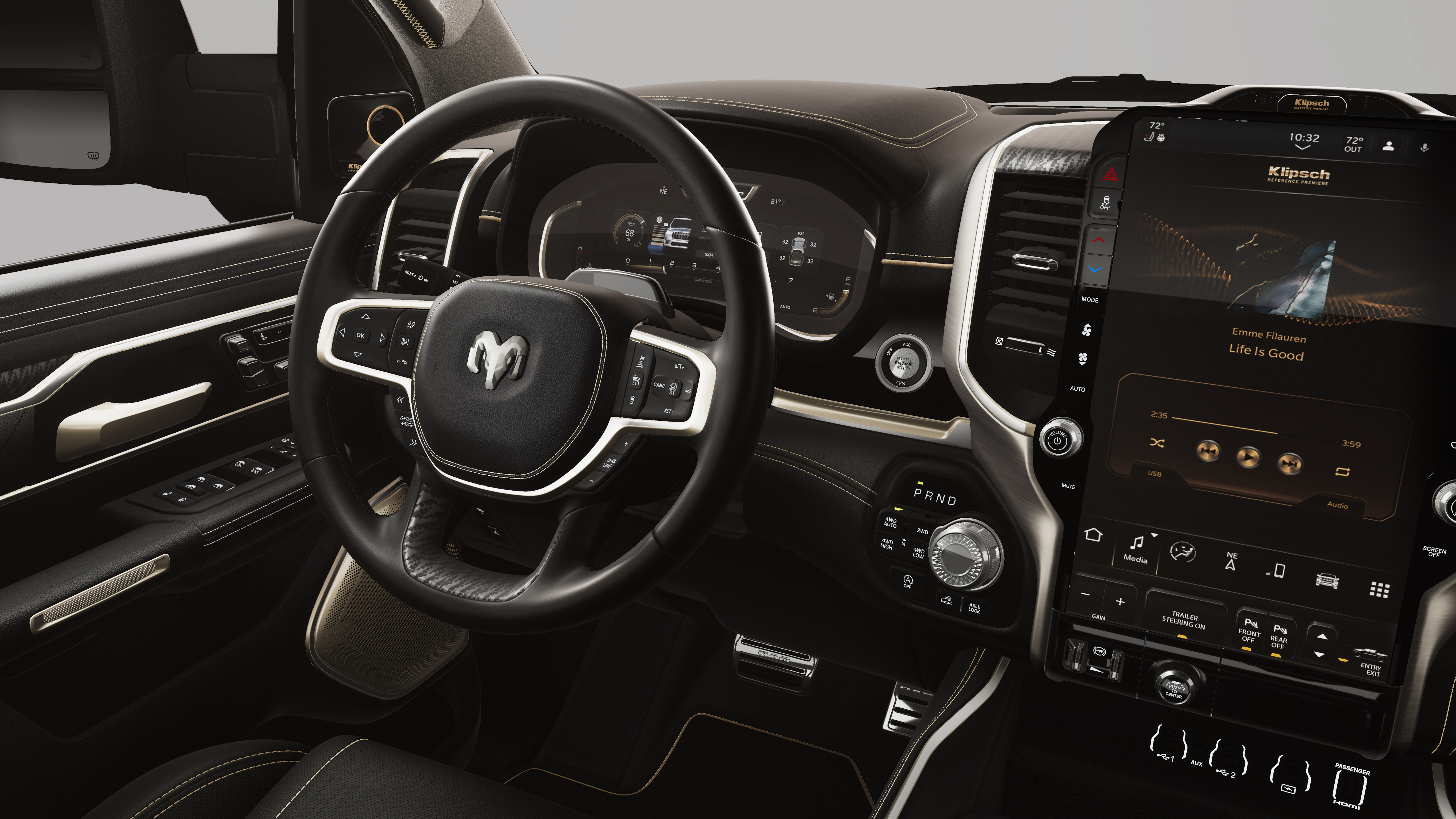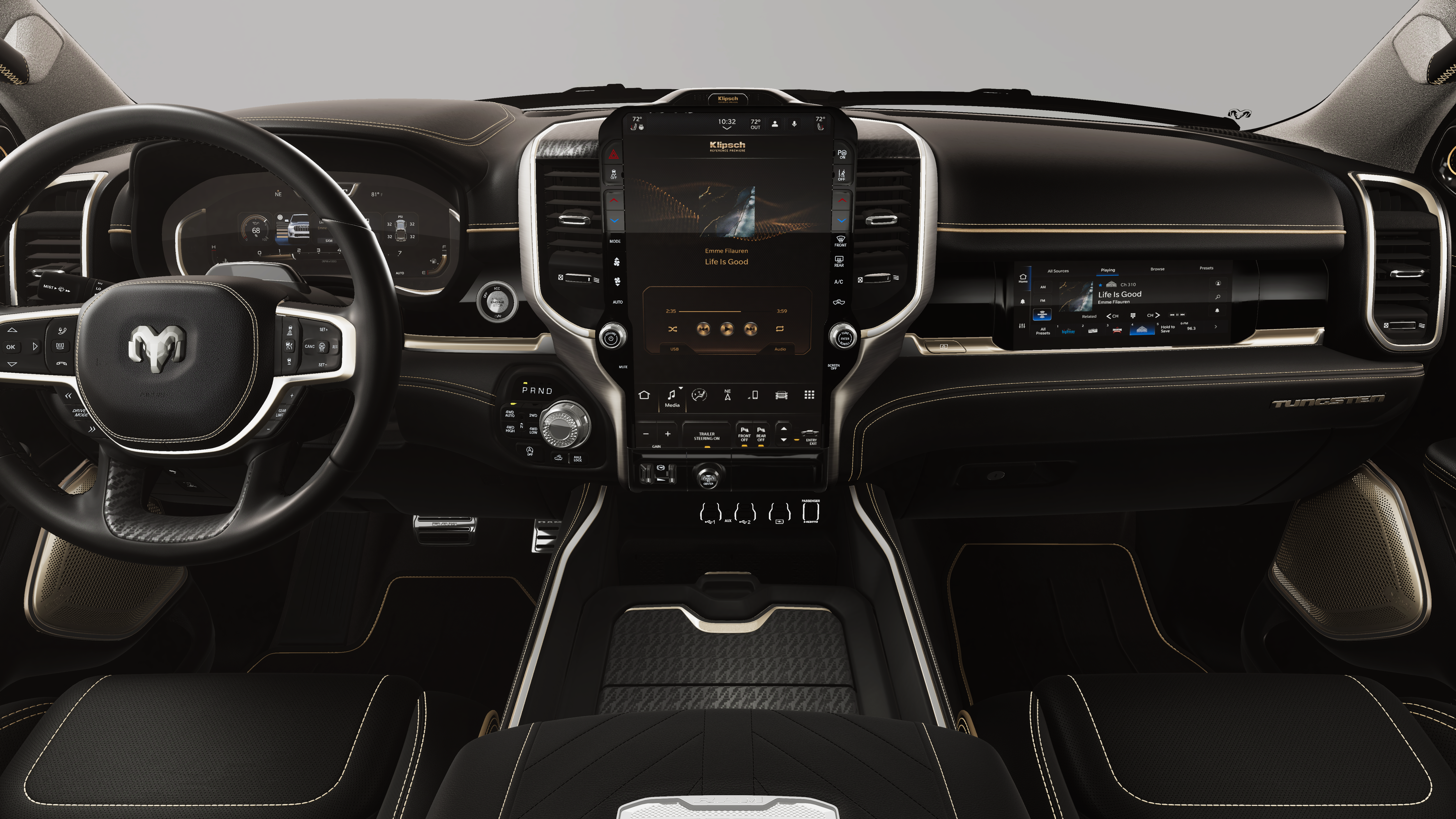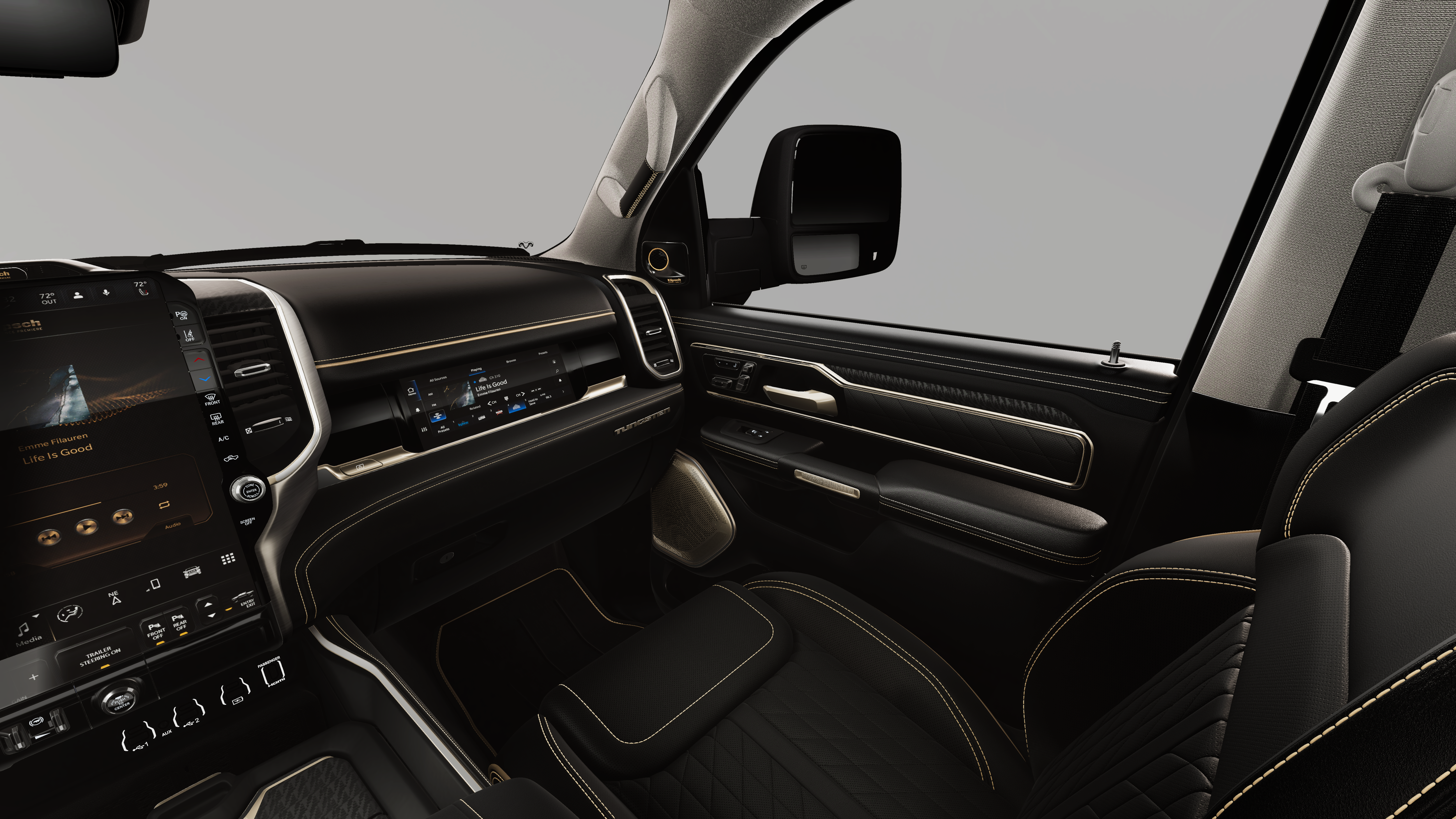 This 2026 Ram 1500 Tungsten comes nicely equipped with the following Bed Utility Group (Exterior 115V AC Outlet, MOPAR 4 Adjustable Cargo Tie-Down Hooks, and Truck Bed Cargo Divider), Off Road Group (E-Locker Rear Axle, Falken Brand Tires, Front Extra Heavy Duty Shock Absorbers, Off Road Decals, Raised Ride Height, Rear Extra Heavy Duty Shock Absorbers, and Selec-Speed Control), Quick Order Package 22V Tungsten, Trailer Tow Group (Trailer Brake Control, Trailer Light Check, Trailer Reverse Steering Control, and Trailer Tire Pressure Monitoring System), 12-Way/1-Way Trailer Connector, 3.92 Rear Axle Ratio, 4-Wheel Disc Brakes, ABS brakes, Adjustable pedals, Air Conditioning, Alloy wheels, AM/FM radio, Apple CarPlay/Android Auto, Audio memory, Auto High-beam Headlights, Auto Power-Folding Mirrors, Auto-dimming door mirrors, Auto-Dimming Exterior Driver Mirror, Auto-Dimming Exterior Passenger Mirror, Auto-dimming Rear-View mirror, Auto-leveling suspension, Automatic temperature control, Bodyside moldings, Brake assist, Bumpers: body-color, Chrome Exterior Mirrors, Chrome Power-Fold Trailer Tow Mirrors, Compass, Delay-off headlights, Driver door bin, Driver vanity mirror, Dual front impact airbags, Dual front side impact airbags, Electronic Stability Control, Exterior Mirrors Courtesy Lamps, Exterior Mirrors with Heating Element, Exterior Mirrors with Memory, Exterior Mirrors with Supplemental Signals, Exterior Parking Camera Rear, Forward and Reverse Utility Lights, Front anti-roll bar, Front Bucket Seats, Front Center Armrest w/Storage, Front dual zone A/C, Front fog lights, Front License Plate Bracket, Front reading lights, Front wheel independent suspension, Fully automatic headlights, Garage door transmitter, Heads-Up Display, Heated door mirrors, Heated front seats, Heated rear seats, Heated steering wheel, Illuminated entry, Leather steering wheel, Low tire pressure warning, Memory seat, Mirror Clearance/Running Lights, MyFlexCare Service Plan, Navigation System, Occupant sensing airbag, Outside temperature display, Overhead airbag, Overhead console, Panic alarm, Passenger door bin, Passenger vanity mirror, Pedal memory, Power adjustable front head restraints, Power door mirrors, Power driver seat, Power moonroof, Power passenger seat, Power steering, Power Telescoping Mirrors, Power windows, Power-Adjustable Convex Aux Mirrors, Premium Leather Bucket Seats, Radio data system, Radio: Uconnect 5 Nav with 14.4 Display, Rain sensing wipers, RAM Tow Assist Kit, Rear anti-roll bar, Rear reading lights, Rear seat center armrest, Rear step bumper, Rear window defroster, Remote keyless entry, Security system, Speed control, Split folding rear seat, Steering wheel mounted audio controls, Tachometer, Telescoping steering wheel, Tilt steering wheel, Traction control, Trailer Tow Mirrors, Trip computer, Turn signal indicator mirrors, Variably intermittent wipers, Ventilated front seats, Ventilated rear seats, Voltmeter, and Wheels: 22 x 9 Polish/Painted with Inserts.