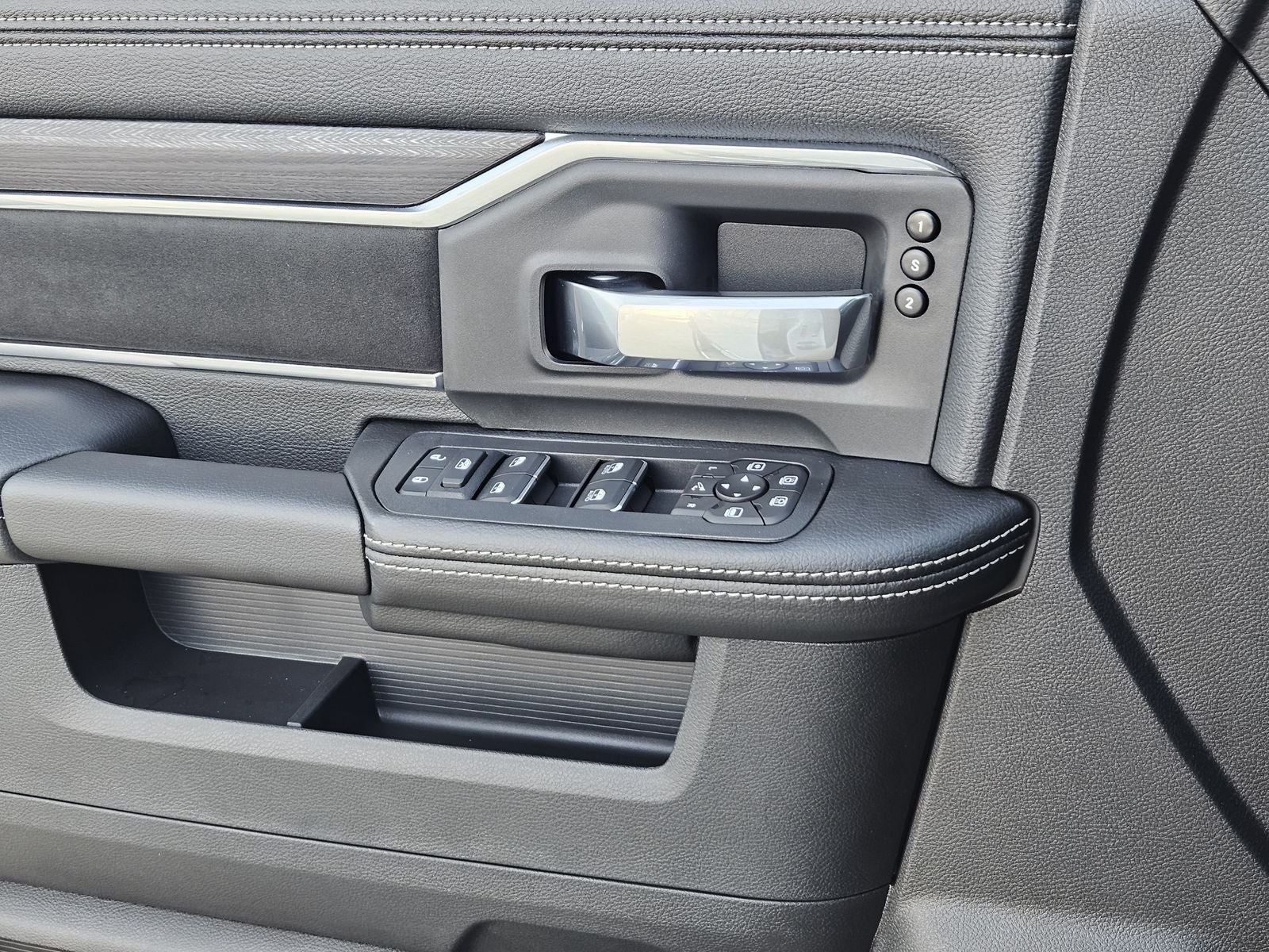 Inside, the Laramie trim focuses on comfort and connectivity. The Uconnect 5 Nav system with a 12-inch touchscreen anchors the cabin, supported by a 12-inch TFT digital cluster and 9 Alpine speakers with subwoofer. Heated front seats, heated steering wheel, dual-zone automatic temperature control, and 8-way power-adjustable front seats create a refined driving experience.