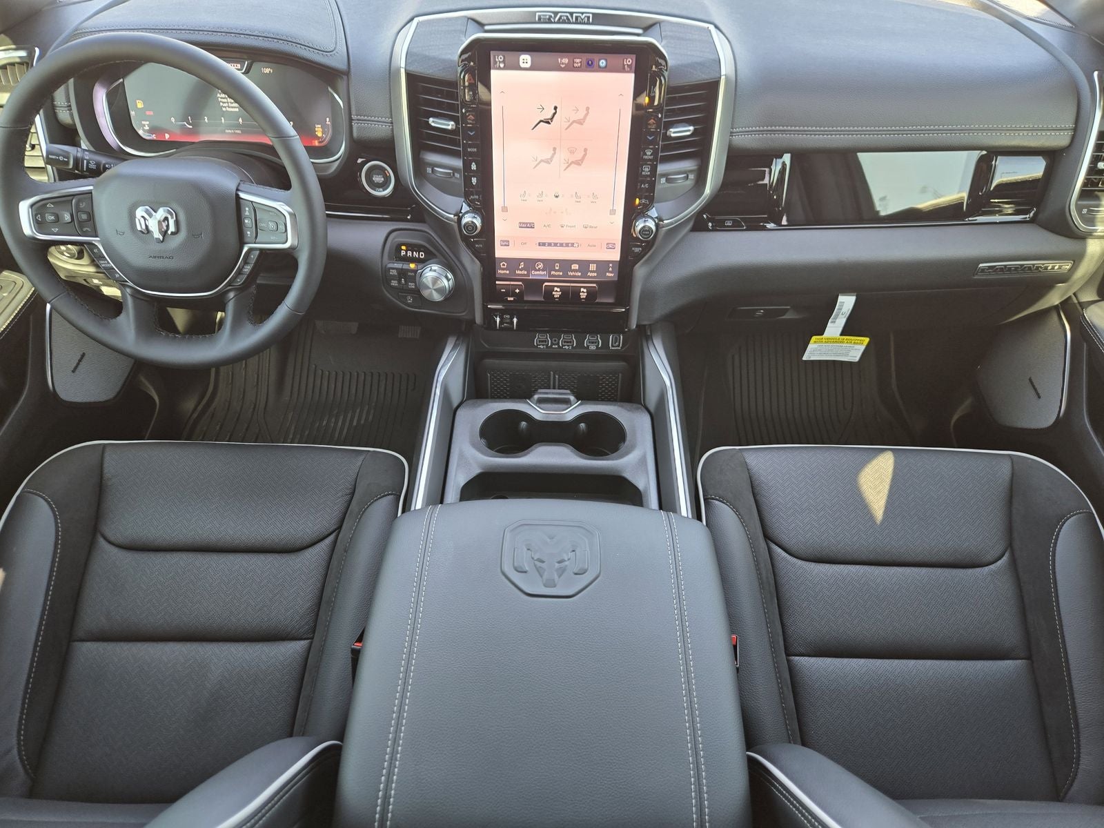 Inside, the Laramie's leather-trimmed bucket seating and memory-equipped power adjustments create a cabin that feels both upscale and functional. Heated and ventilated front seats, heated second-row seating, and a leather-wrapped heated steering wheel ensure year-round comfort, while Rams thoughtful interior layout keeps controls intuitive and storage practical.