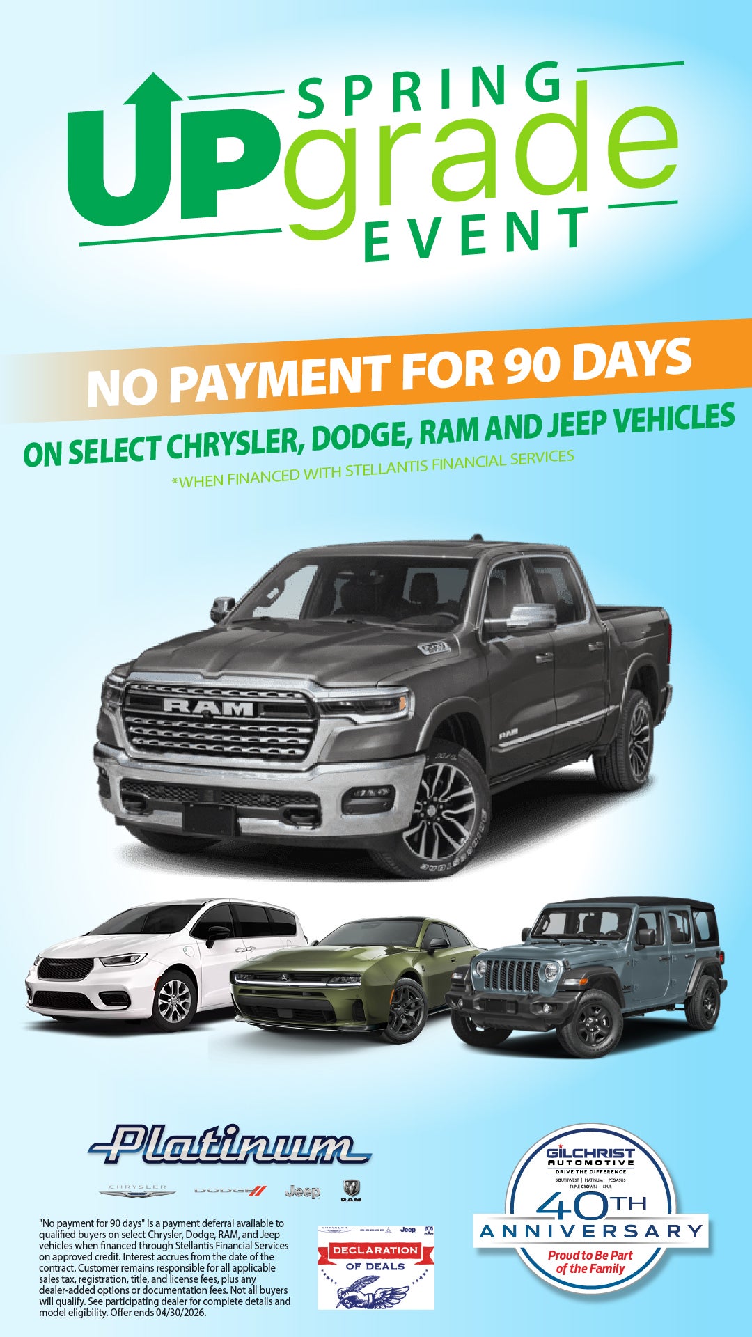 "No payment for 90 days" is a payment deferral available to qualified buyers on select Chrysler, Dodge, RAM, and Jeep vehicles when financed through Stellantis Financial Services on approved credit. Interest accrues from the date of the contract. Customer remains responsible for all applicable sales tax, registration, title, and license fees, plus any dealer-added options or documentation fees. Not all buyers will qualify. See participating dealer for complete details and model eligibility. Offer ends 04/30/2026.