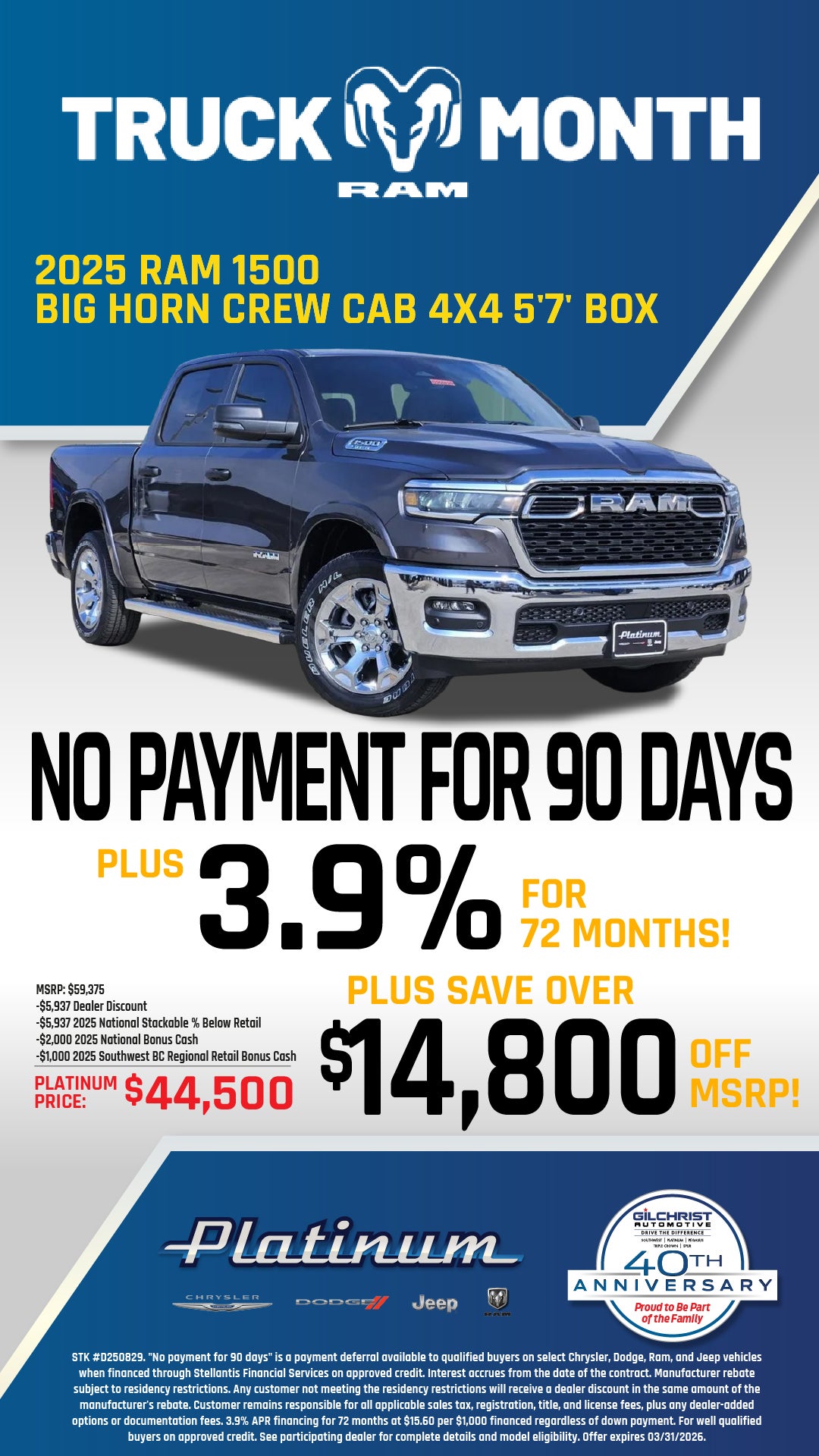 STK #D250829. "No payment for 90 days" is a payment deferral available to qualified buyers on select Chrysler, Dodge, Ram, and Jeep vehicles when financed through Stellantis Financial Services on approved credit. Interest accrues from the date of the contract. Manufacturer rebate subject to residency restrictions. Any customer not meeting the residency restrictions will receive a dealer discount in the same amount of the manufacturer's rebate. Customer remains responsible for all applicable sales tax, registration, title, and license fees, plus any dealer-added options or documentation fees. 3.9% APR financing for 72 months at $15.60 per $1,000 financed regardless of down payment. For well qualified buyers on approved credit. See participating dealer for complete details and model eligibility. Offer expires 03/31/2026.