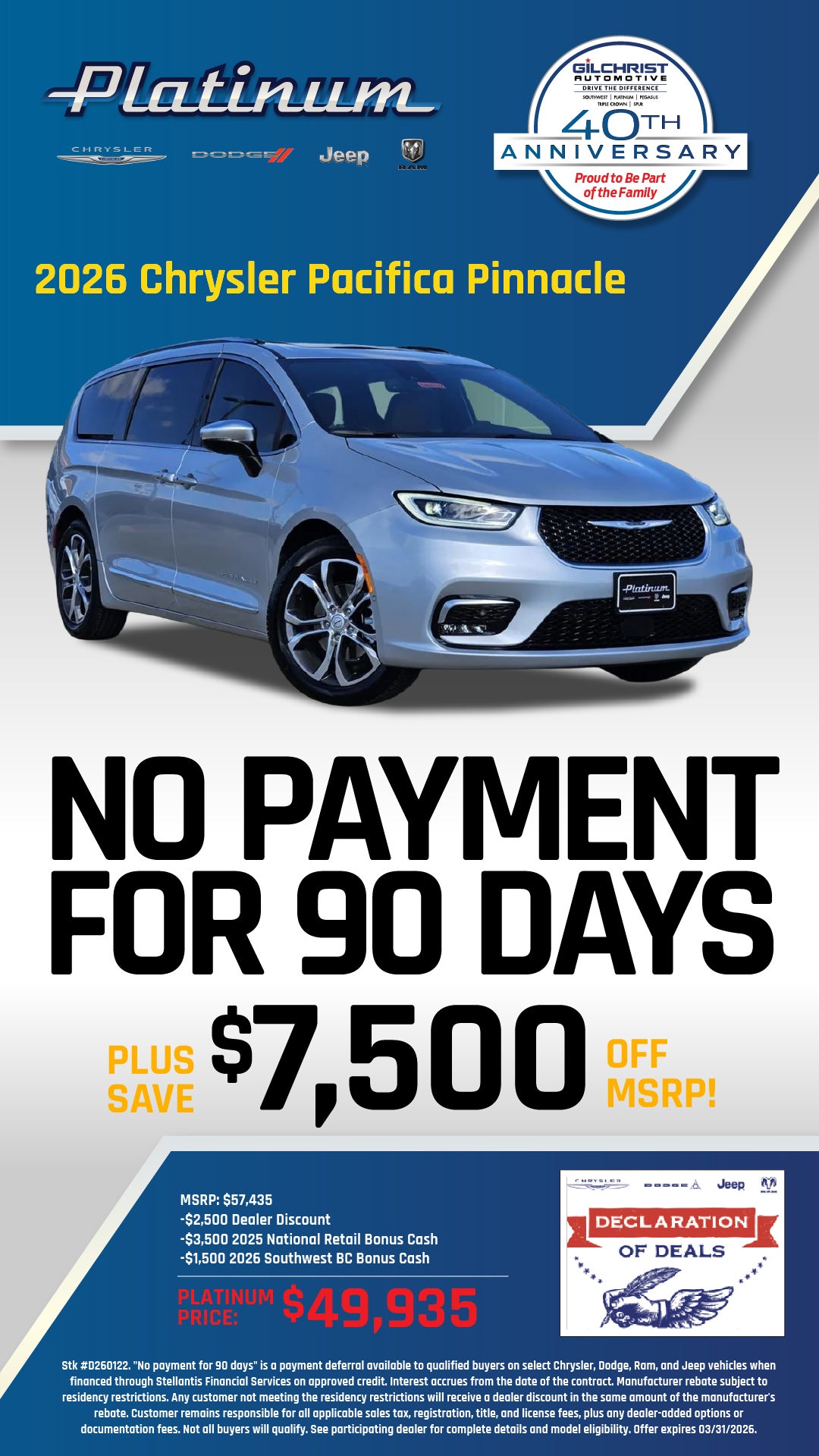 Stk #D260122. "No payment for 90 days" is a payment deferral available to qualified buyers on select Chrysler, Dodge, Ram, and Jeep vehicles when financed through Stellantis Financial Services on approved credit. Interest accrues from the date of the contract. Manufacturer rebate subject to residency restrictions. Any customer not meeting the residency restrictions will receive a dealer discount in the same amount of the manufacturer's rebate. Customer remains responsible for all applicable sales tax, registration, title, and license fees, plus any dealer-added options or documentation fees. Not all buyers will qualify. See participating dealer for complete details and model eligibility. Offer expires 03/31/2026.