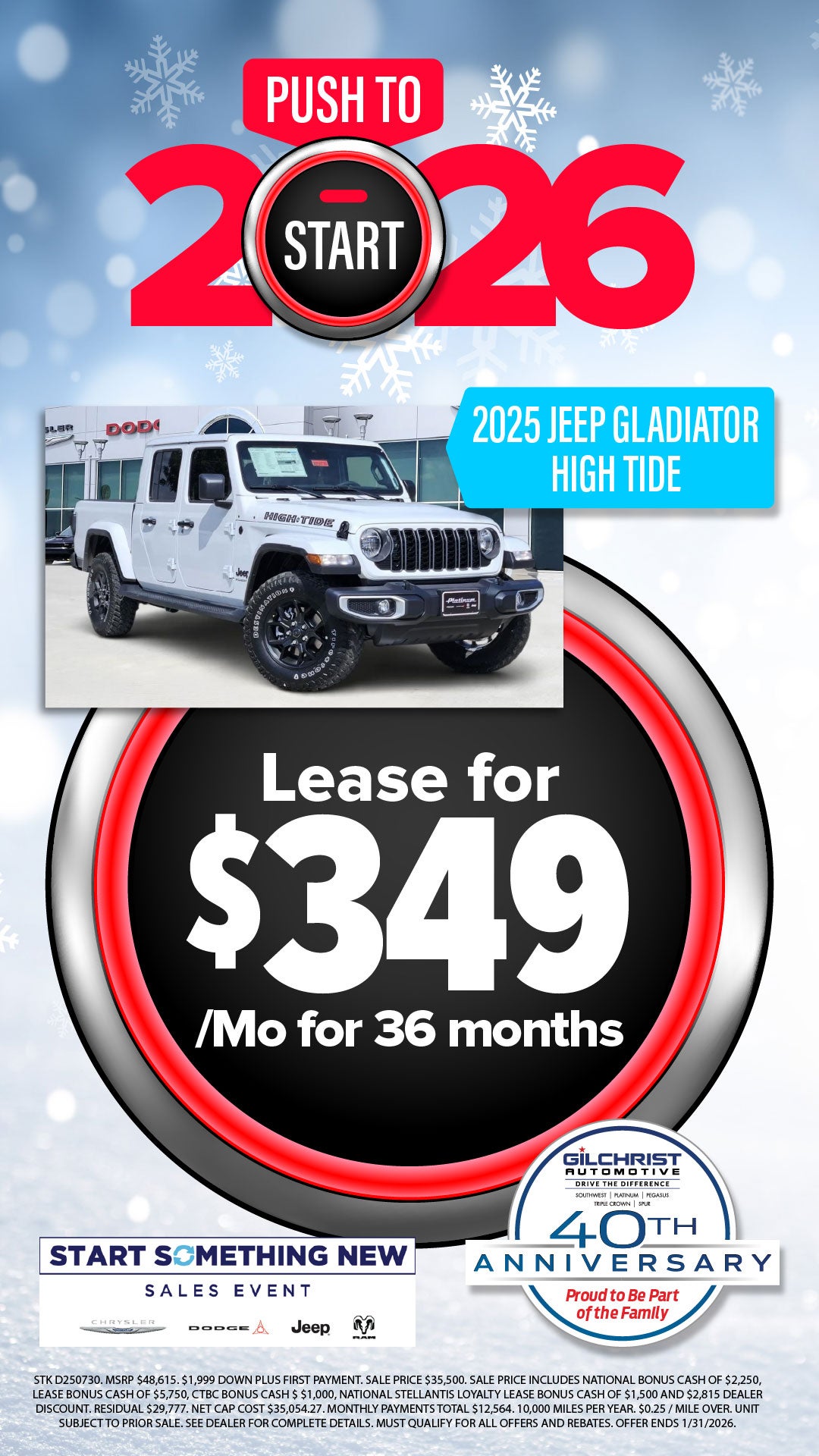 2025 JEEP GLADIATOR HIGH TIDE Lease for $349 / month for 36 Months STK D250730. MSRP $48,615. $1,999 DOWN PLUS FIRST PAYMENT. SALE PRICE $35,500. SALE PRICE INCLUDES NATIONAL BONUS CASH OF $2250, LEASE BONUS CASH OF $5750, CTBC BONUS CASH $ $1000, NATIONAL STELLANTIS LOYALTY LEASE BONUS CASH OF $1500 AND $2815 DEALER DISCOUNT. RESIDUAL $29,777. NET CAP COST $35,054.27. MONTHLY PAYMENTS TOTAL $12,564. 10000 MILES PER YEAR. $0.25 / MILE OVER. UNIT SUBJECT TO PRIOR SALE. SEE DEALER FOR COMPLETE DETAILS. MUST QUALIFY FOR ALL OFFERS AND REBATES. OFFER ENDS 1/31/2026