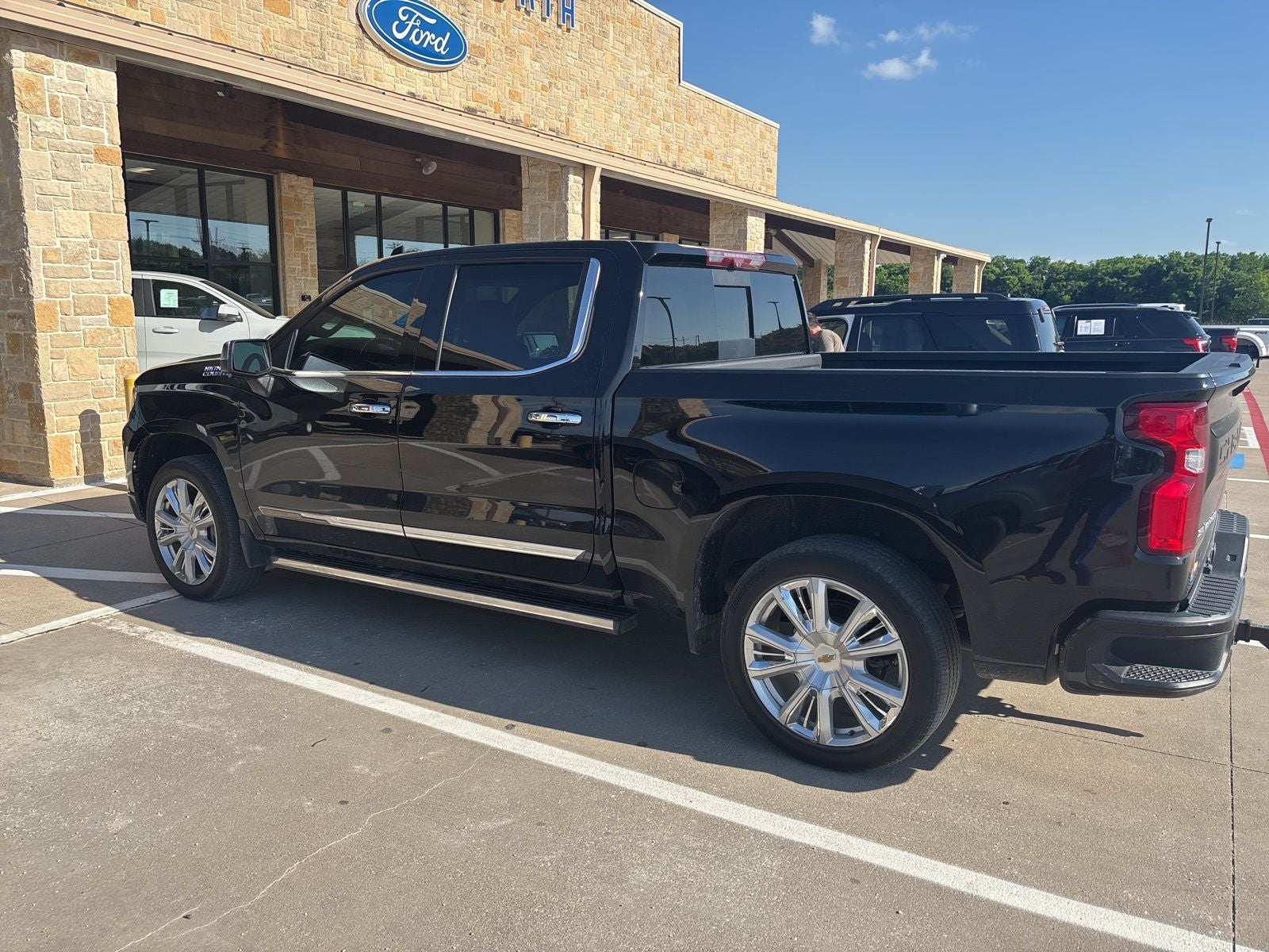 This 2022 Chevrolet Silverado 1500 High Country in Black comes with the following features: EcoTec3 5.3L V8 10-Speed Automatic 4WD High Capacity Suspension Package, High Country Premium Package (All-Weather Floor Liner (LPO), Power Sunroof, and Wheels: 22 x 9 Painted Aluminum), Preferred Equipment Group 3LZ (10-Way Power Driver Seat w/Lumbar, 10-Way Power Passenger Seat Adjuster w/Lumbar, 12.3 Multicolor Reconfigurable Digital Display, 120-Volt Bed Mounted Power Outlet, 120-Volt Instrument Panel Power Outlet, 2 USB Data Ports, 2nd Row Heated Outboard Seats, Auto-Dimming Inside Rear-View Mirror, Auto-Locking Rear Differential, Bed View Camera, Bluetooth® For Phone, Body-Color Painted Mirror Caps, Chevrolet Connected Access Capable, Chevytec Spray-On Black Bedliner, Chrome Assist Steps, Chrome Recovery Hooks, Color-Keyed Carpeting Floor Covering, Compass, Deep-Tinted Glass, Driver Memory, Dual Exhaust w/Polished Outlets, Dual Rear USB Ports (Charge Only), Electric Rear-Window Defogger, Electrical Steering Column Lock, Electronic Cruise Control, Floor Mounted Center Console, Front Carpeted Floor Mats, Front LED Fog Lamps, Front Rainsensing Wipers, HD Surround Vision, Heated Driver & Front Outboard Passenger Seats, Heated Steering Wheel, Hitch Guidance w/Hitch View, Integrated Trailer Brake Controller, Keyless Open & Start, Leather Wrapped Steering Wheel, LED Cargo Area Lighting, OnStar & Chevrolet Connected Services Capable, Outside Heated Power-Adjustable Mirrors, Perimeter Lighting, Power Front Passenger Windows w/Express Up/Down, Power Front Windows w/Driver Express Up/Down, Power Rear Windows w/Express Down, Power Sliding Rear Window w/Rear Defogger, Power Tailgate, Power Tilt & Telescoping Steering Column, Rear Carpeted Floor Mats, Rear Cross Traffic Alert-Braking, Rear Pedestrian Detection, Rear Wheelhouse Liners, Remote Vehicle Starter System, Safety Alert Seat, SiriusXM w/360L, Standard Tailgate, Steering Wheel Audio Controls, Theft Deterrent System (Unauthorized Entry), Trailer Camera Provisions, Trailer Side Blind Zone Alert, Trailering App, Ultrasonic Front & Rear Park Assist, Universal Home Remote, Ventilated Driver & Front Passenger Seats, Wi-Fi Hot Spot Capable, Wireless Charging, and Wireless Phone Projection), Technology Package (15 Diagonal Multicolor Head-Up Display, Adaptive Cruise Control, and Rear Camera Mirror), Trailering Package (Hitch Guidance), Up-Level Rear Seat w/Storage Package, Silverado 1500 High Country, Ford Blue Advantage: Blue Certified Certified, 4D Crew Cab, EcoTec3 5.3L V8, 10-Speed Automatic, 4WD, Black, Jet Black/Nightshift Blue Leather, 170 Amp Alternator, 3.23 Rear Axle Ratio, 4-Wheel Disc Brakes, 7 Speakers, ABS brakes, Adaptive Ride Control Suspension, Air Conditioning, Alloy wheels, AM/FM radio: SiriusXM with 360L, Apple CarPlay/Android Auto, Auto High-beam Headlights, Auto-dimming door mirrors, Auto-dimming Rear-View mirror, Automatic Emergency Braking, Automatic temperature control, Bodyside moldings, Brake assist, Bumpers: body-color, Delay-off headlights, Driver door bin, Driver vanity mirror, Dual front impact airbags, Dual front side impact airbags, Electronic Stability Control, Electronic Transmission Range Selector Shifter, Following Distance Indicator, Forward Collision Alert, Front anti-roll bar, Front Bucket Seats, Front Center Armrest, Front dual zone A/C, Front fog lights, Front License Plate Kit, Front Pedestrian Braking, Front reading lights, Front wheel independent suspension, Fully automatic headlights, Garage door transmitter, Genuine wood console insert, Genuine wood dashboard insert, Genuine wood door panel insert, Heated door mirrors, Heated front seats, Heated rear seats, Heated steering wheel, Illuminated entry, IntelliBeam Automatic High Beam On/Off, Lane Keep Assist w/Lane Depar
