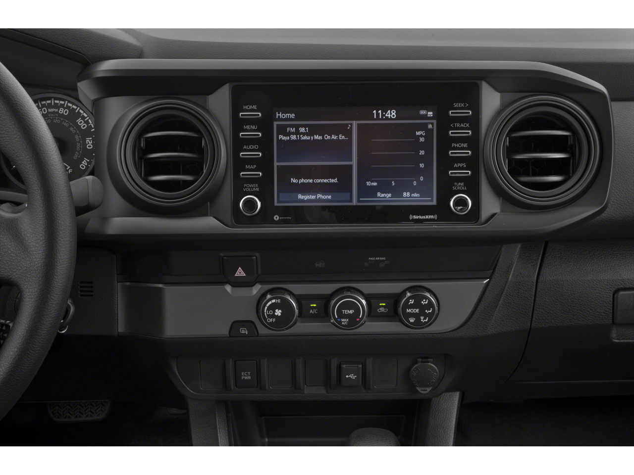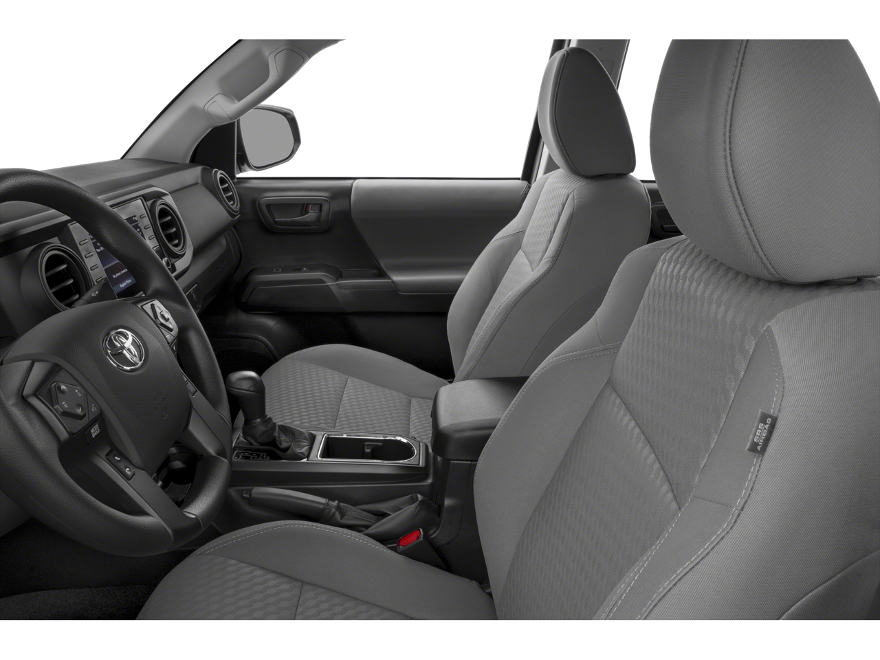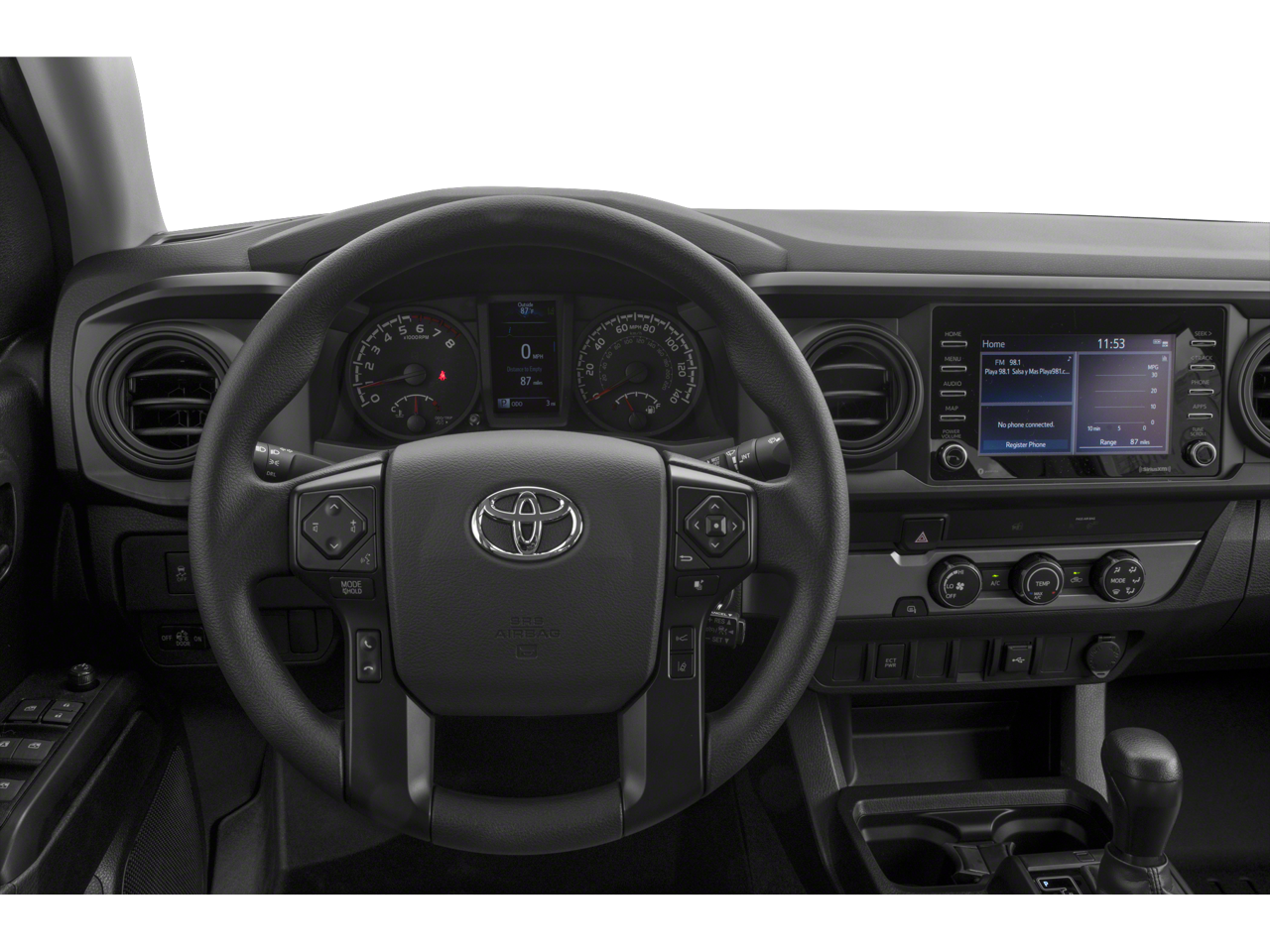 This 2023 Toyota Tacoma V6 in Black comes with the following features: 3.5L V6 6-Speed 4WD 4WD, 120V/400W Deck Mounted AC Power, ABS brakes, Air Conditioning, Alloy wheels, AM/FM radio: SiriusXM, Anti-whiplash front head restraints, Apple CarPlay/Android Auto, Auto High-beam Headlights, Auto-dimming Rear-View mirror, Auto-Dimming Rearview Mirror w/HomeLink, Automatic temperature control, Blind Spot Monitor w/Rear Cross Traffic Alert, Brake assist, Bumpers: body-color, Driver door bin, Dual front impact airbags, Dual front side impact airbags, Electronic Stability Control, Emergency communication system: Safety Connect (1-year trial), Engine Immobilizer, Exterior Parking Camera Rear, Front anti-roll bar, Front Bucket Seats, Front Center Armrest, Front dual zone A/C, Front fog lights, Front reading lights, Front wheel independent suspension, Garage door transmitter: HomeLink, Heated door mirrors, Illuminated entry, Knee airbag, Leather Shift Knob, Low tire pressure warning, Occupant sensing airbag, Outside temperature display, Overhead airbag, Overhead console, Panic alarm, Passenger door bin, Power door mirrors, Power driver seat, Power Sliding Rear Window w/Privacy Glass, Power steering, Power windows, Rear Parking Assist Sonar, Rear step bumper, Remote keyless entry, Security system, Speed control, Speed-sensing steering, Split folding rear seat, Steering wheel mounted audio controls, Tachometer, Telescoping steering wheel, Tilt steering wheel, Traction control, Trip computer, Turn signal indicator mirrors, and Variably intermittent wipers.