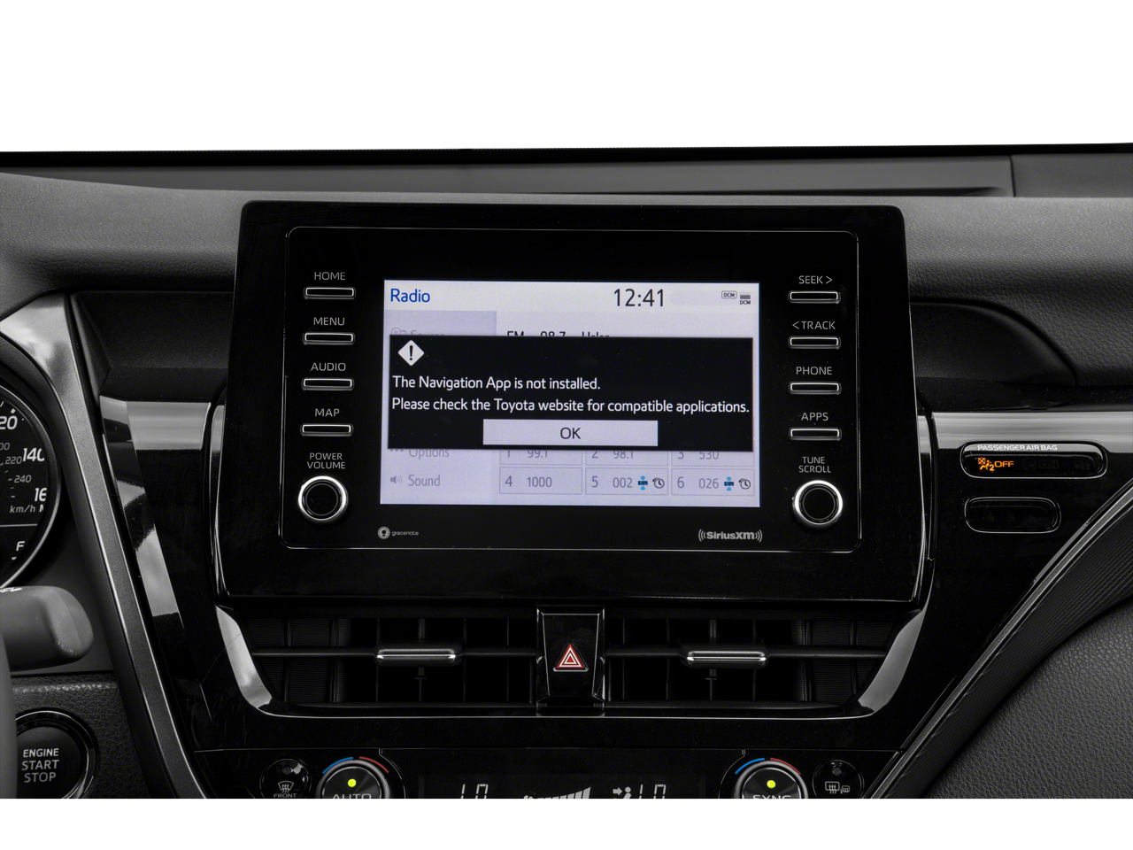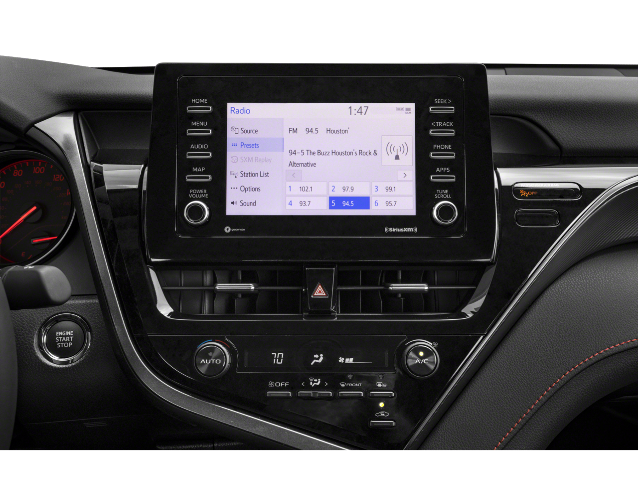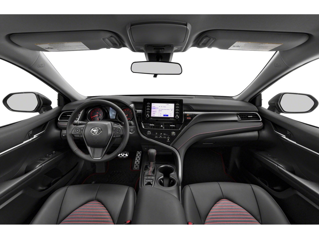 This 2024 Toyota Camry comes nicely equipped with Black Artificial Leather, 4-Wheel Disc Brakes, 6 Speakers, ABS brakes, Air Conditioning, Alloy wheels, AM/FM radio: SiriusXM, Apple CarPlay/Android Auto, Auto High-beam Headlights, Automatic temperature control, Brake assist, Bumpers: body-color, Delay-off headlights, Driver door bin, Driver vanity mirror, Dual front impact airbags, Dual front side impact airbags, Electronic Stability Control, Emergency communication system: Safety Connect (1-year trial), Exterior Parking Camera Rear, Four wheel independent suspension, Front anti-roll bar, Front Bucket Seats, Front Center Armrest, Front dual zone A/C, Front reading lights, Fully automatic headlights, Heated door mirrors, Illuminated entry, Knee airbag, Leather steering wheel, Low tire pressure warning, Occupant sensing airbag, Outside temperature display, Overhead airbag, Overhead console, Panic alarm, Passenger door bin, Passenger vanity mirror, Power door mirrors, Power driver seat, Power steering, Power windows, Radio data system, Radio: Audio, Rear anti-roll bar, Rear seat center armrest, Rear side impact airbag, Rear window defroster, Remote keyless entry, Security system, Speed control, Speed-sensing steering, Split folding rear seat, Spoiler, Sport SofTex Seat Trim w/Fabric Inserts, Steering wheel mounted audio controls, Tachometer, Telescoping steering wheel, Tilt steering wheel, Traction control, Trip computer, Turn signal indicator mirrors, Variably intermittent wipers, and Wheels: 19 x 8.5J Alloy.