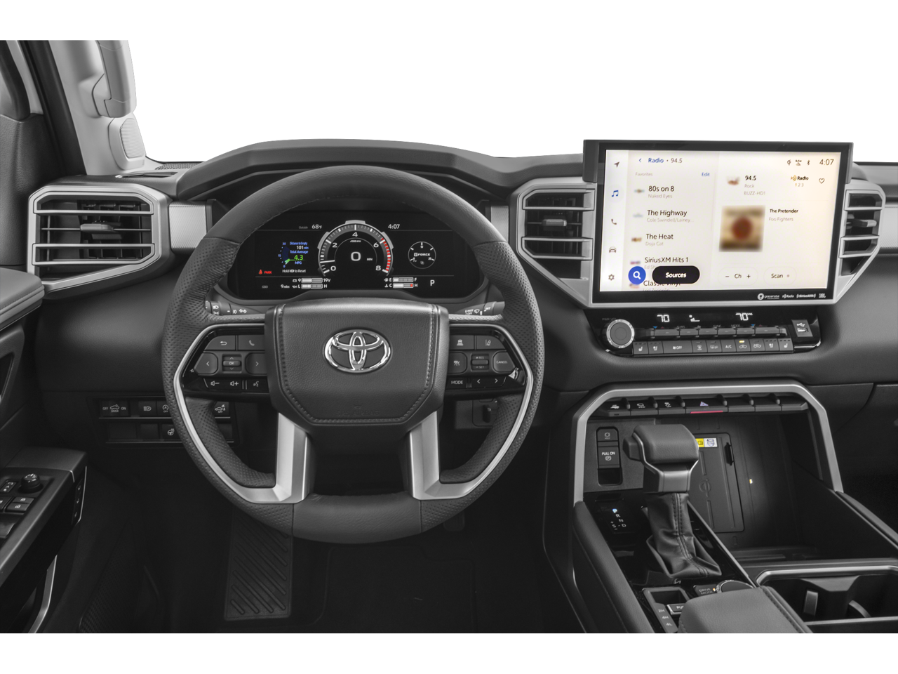 This 2026 Toyota Tundra 4WD comes nicely equipped with Nightshade Package (Wheels: 20 x 8J Matte Black TRD Sport Style), Panoramic View Monitor Package, Power Package (120V Deck and Cabin Power Supply and Wireless Charger), Premium Package (High Grade Full LED Headlamp), 20 Alloy Wheels, 3.31 Axle Ratio, 4-Wheel Disc Brakes, 8-Way Power Adjustable Heated/Ventilated Front Seats, 9 Speakers, ABS brakes, Air Conditioning, Alloy wheels, AM/FM radio: SiriusXM, Apple CarPlay/Android Auto, Auto High-beam Headlights, Auto-dimming door mirrors, Auto-dimming Rear-View mirror, Automatic temperature control, Bed Step, Brake assist, Bumpers: body-color, Delay-off headlights, Driver door bin, Driver vanity mirror, Dual front impact airbags, Dual front side impact airbags, Dual-Step Running Board - Black, Electronic Stability Control, Emergency communication system: Safety Connect (up to 10-year trial subscription), Exterior Parking Camera Rear, Folding Color-Keyed Outside Mirrors, Front anti-roll bar, Front Bucket Seats, Front Center Armrest, Front dual zone A/C, Front fog lights, Front reading lights, Front wheel independent suspension, Fully automatic headlights, Garage door transmitter: HomeLink, Heated door mirrors, Heated front seats, Heated Leather Steering Wheel, Illuminated entry, JBL Premium Audio, Knee airbag, Leather Seat Trim, Leather Shift Knob, Leather steering wheel, Low tire pressure warning, Memory seat, Navigation system: Drive Connect Cloud Navigation (1-year trial subscription), Occupant sensing airbag, Outside temperature display, Overhead airbag, Overhead console, Panic alarm, Panoramic Sunroof and Moonroof, Passenger door bin, Passenger vanity mirror, Power door mirrors, Power driver seat, Power passenger seat, Power steering, Power windows, Radio data system, Radio: Audio Plus, Rear reading lights, Rear seat center armrest, Rear step bumper, Rear window defroster, Remote keyless entry, Safety Connect, Security system, Speed control, Speed-sensing steering, Split folding rear seat, Steering wheel mounted audio controls, Tachometer, Telescoping steering wheel, Tilt steering wheel, Traction control, Trip computer, Turn signal indicator mirrors, Variably intermittent wipers, Ventilated front seats, and Voltmeter.